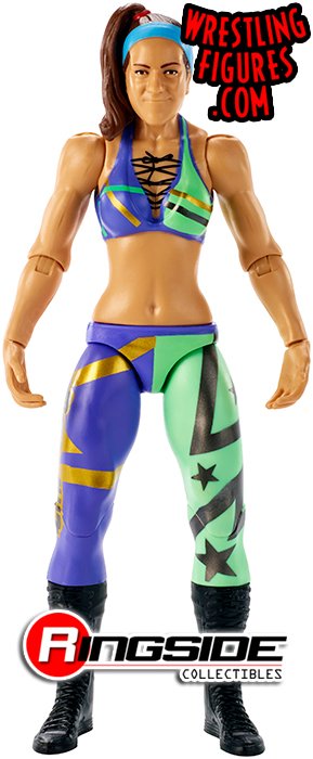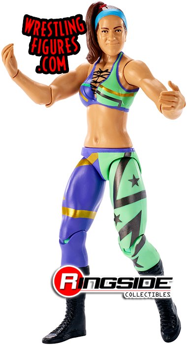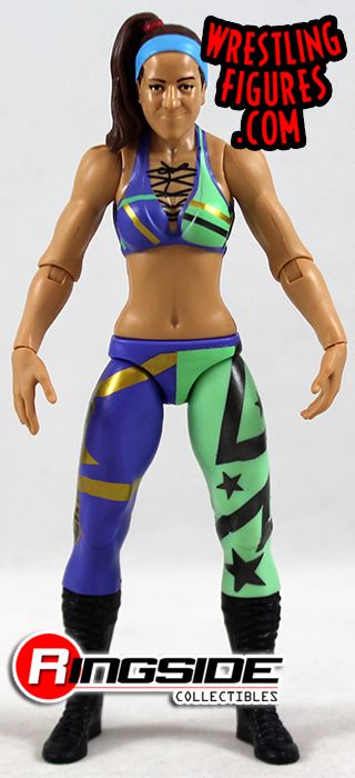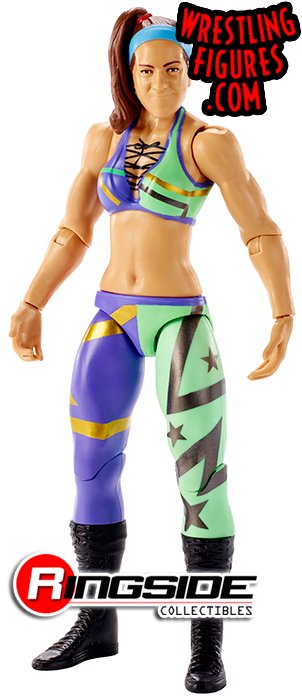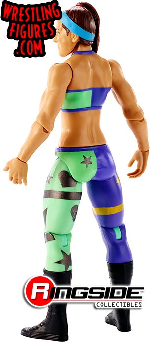 No stopping the big hugs from Bayley in Mattel WWE Series 87! She's wearing her side-pony proudly and has a blue headband to match (in her own way) her colorful half purple, half green ring gear with gold and black stripes and stars designs! With black boots, she's ready for action.